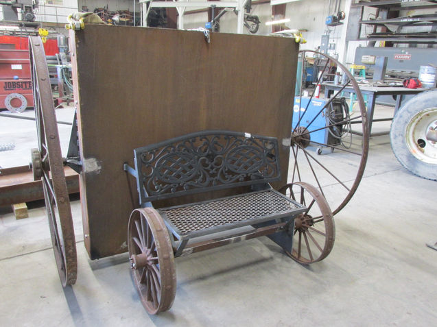 Client criteria: create a sculptural feature using a collection of iron wheels and a piano sound board and harp with strings/wires